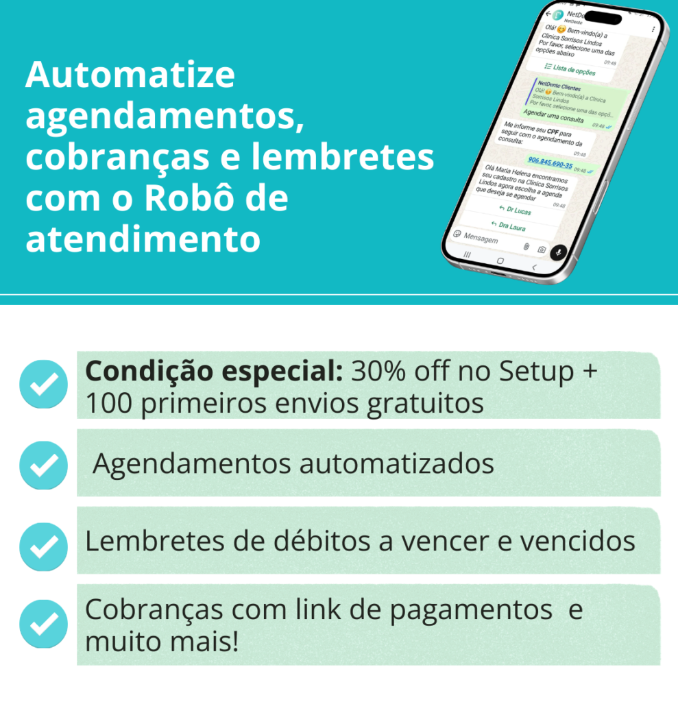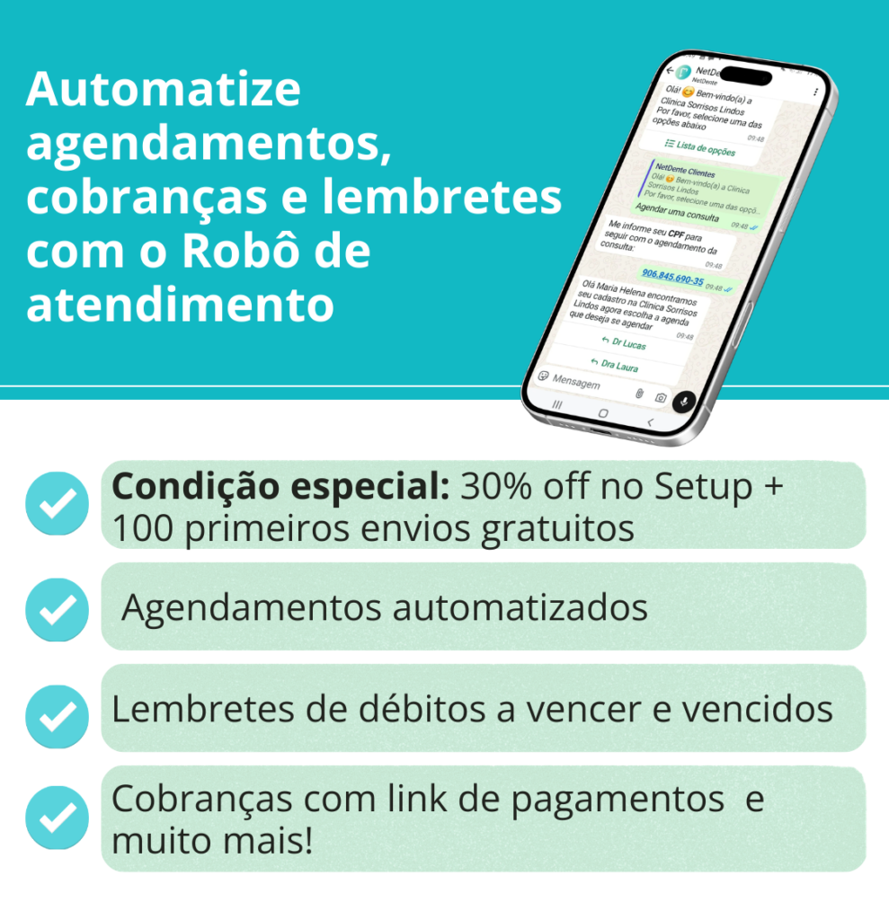 Envie confirmações automáticas via WhatsApp, gerencie salas, encaixes e retornos, utilize assinaturas eletrônicas e termos de aceite de forma gratuita e acompanhe resultados com dashboards e relatórios inteligentes e muito mais!Gerencie convênios, recebimentos, parcelamentos e comissionamento de dentistas de forma simples e eficiente.
